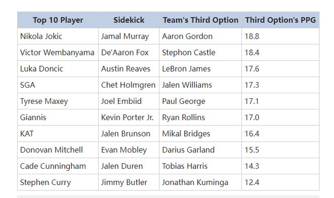 如果我们将前10球员所在球队第三选择的加进来,就能看出问题所在了,勇士队前三名球员的平均得分直接垫底,而且要比倒数第二的活塞队三人组低出很多,这也是勇士队最大的漏洞。勇士队的第三选择是库明加,很容易在这里垫底,而且随着库明加掉出轮换阵容,他根本没有足够的上场时间来提升自己的场均得分,因此他们的第三选择的得分可能还会下降更多。排名前9的三人组合的平均得分为16.9分,而勇士队只有12.4分,场均多达4.5分,显然勇士队在第三得分点方面是一个巨大的劣势,而且情况还会越来越差。
