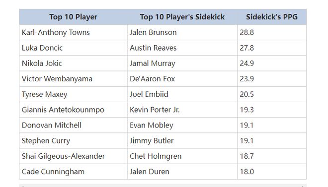 按照EPM(估计正负值,估算球员每百回合能为球队带来的净胜分)来看,目前排名前十的球员分别是俄克拉荷马雷霆队的亚历山大、掘金队的约基奇、雄鹿队的字母哥、勇士队的库里、湖人队的东契奇、尼克斯的唐斯、骑士队的米切尔、马刺队的文班亚马、活塞队的坎宁安和76人队马克西。